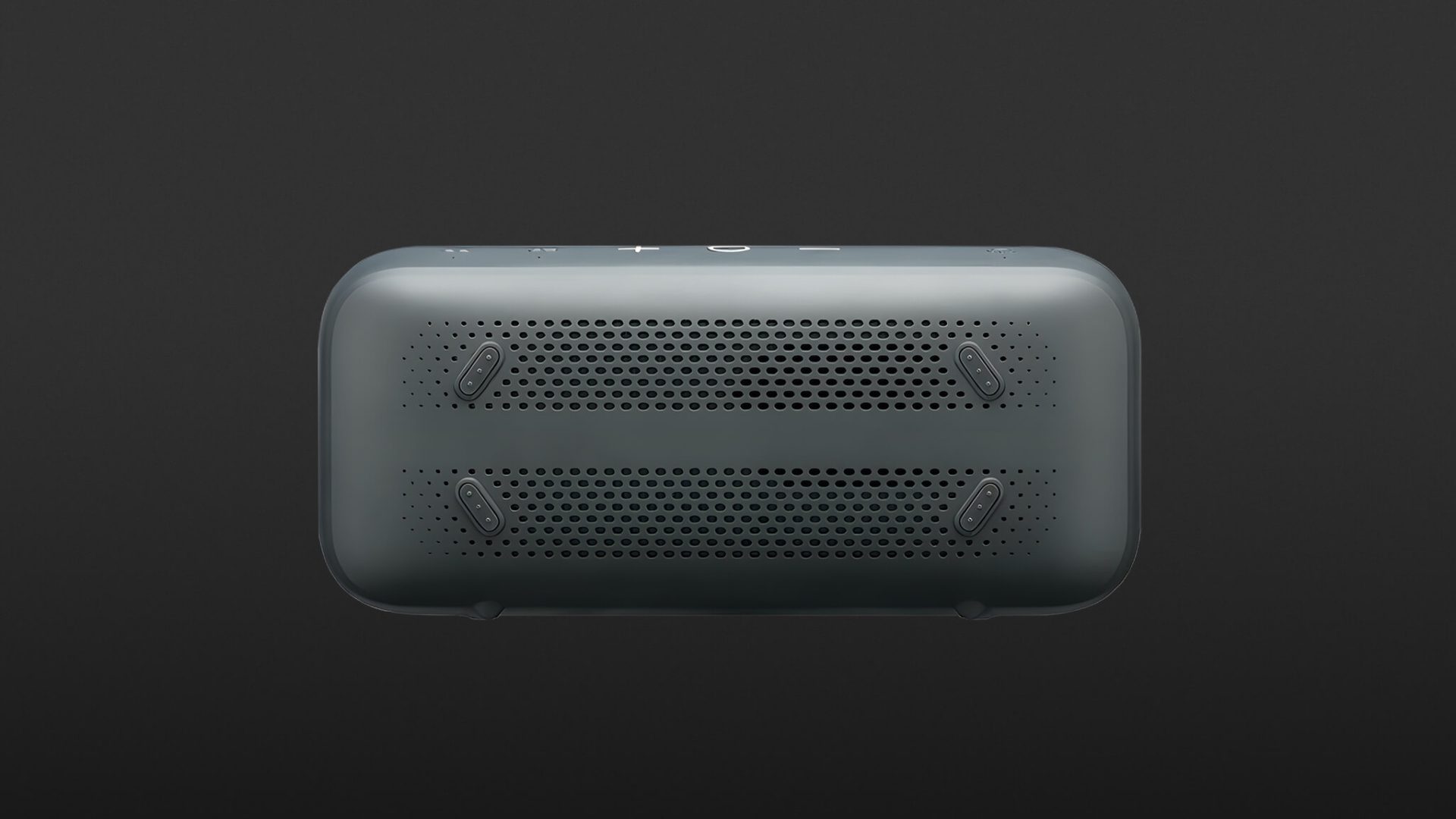 Ummantelt von kräftigem Plastik werden Front und Rückseite von Lautsprechergittern dominiert, wohinter sich vorne der nicht näher beschriebene Treiber, daneben ein passiver Radiator und hinten eine Bassreflexöffnung befinden. Auf der Oberseite sind, gut zu ertasten, die Bedienelemente verteilt, an der einen Seite befindet sich ein USB-C-Port an der anderen die Halterung für die Trageschlaufe. Unterseite und Rückseite sind dann noch mit gummierten Füßen versehen, sodass die Box stehend als auch liegend betrieben werden kann, ohne zu verrutschen.