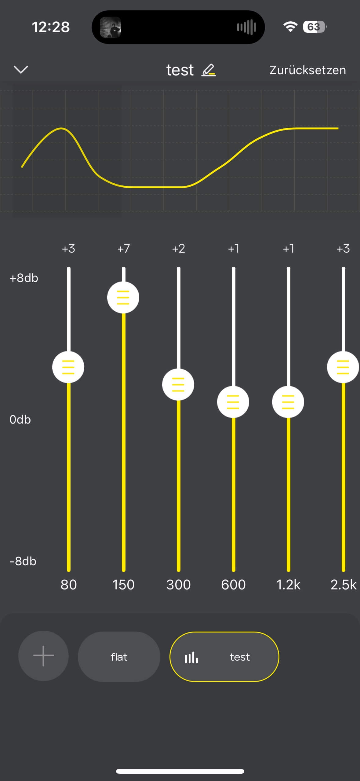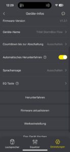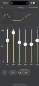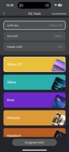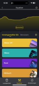 Weitere Funktionen werden in der App geregelt. Zur Verfügung stehen dort sechs EQ-Presets und ein Bereich für eigene Einstellung, die an neun Bändern vorgenommen und abgespeichert werden können. Darüber hinaus lässt sich ein Abschalttimer einstellen, Updates einspielen und festlegen, welche Presets auf die EQ-Taste am Gerät aufrufbar gemacht werden sollen.