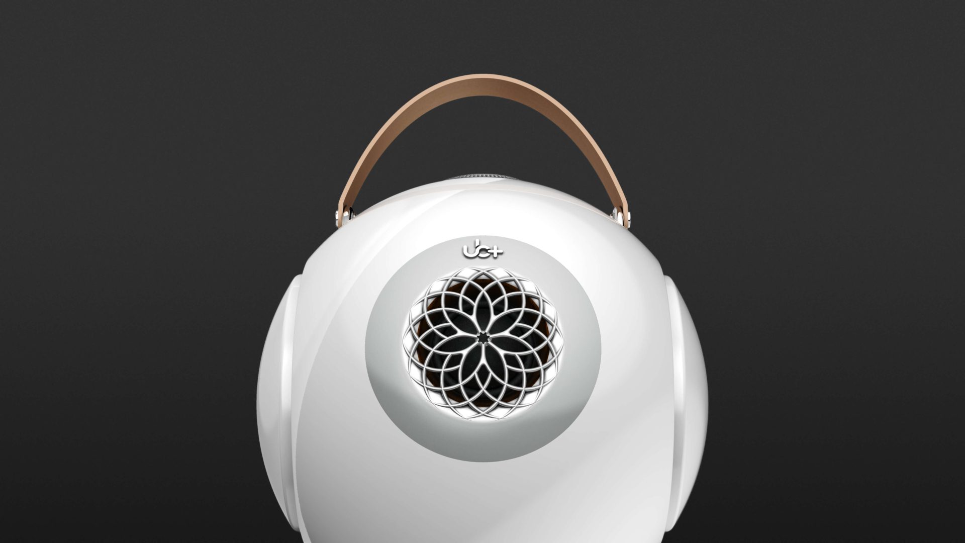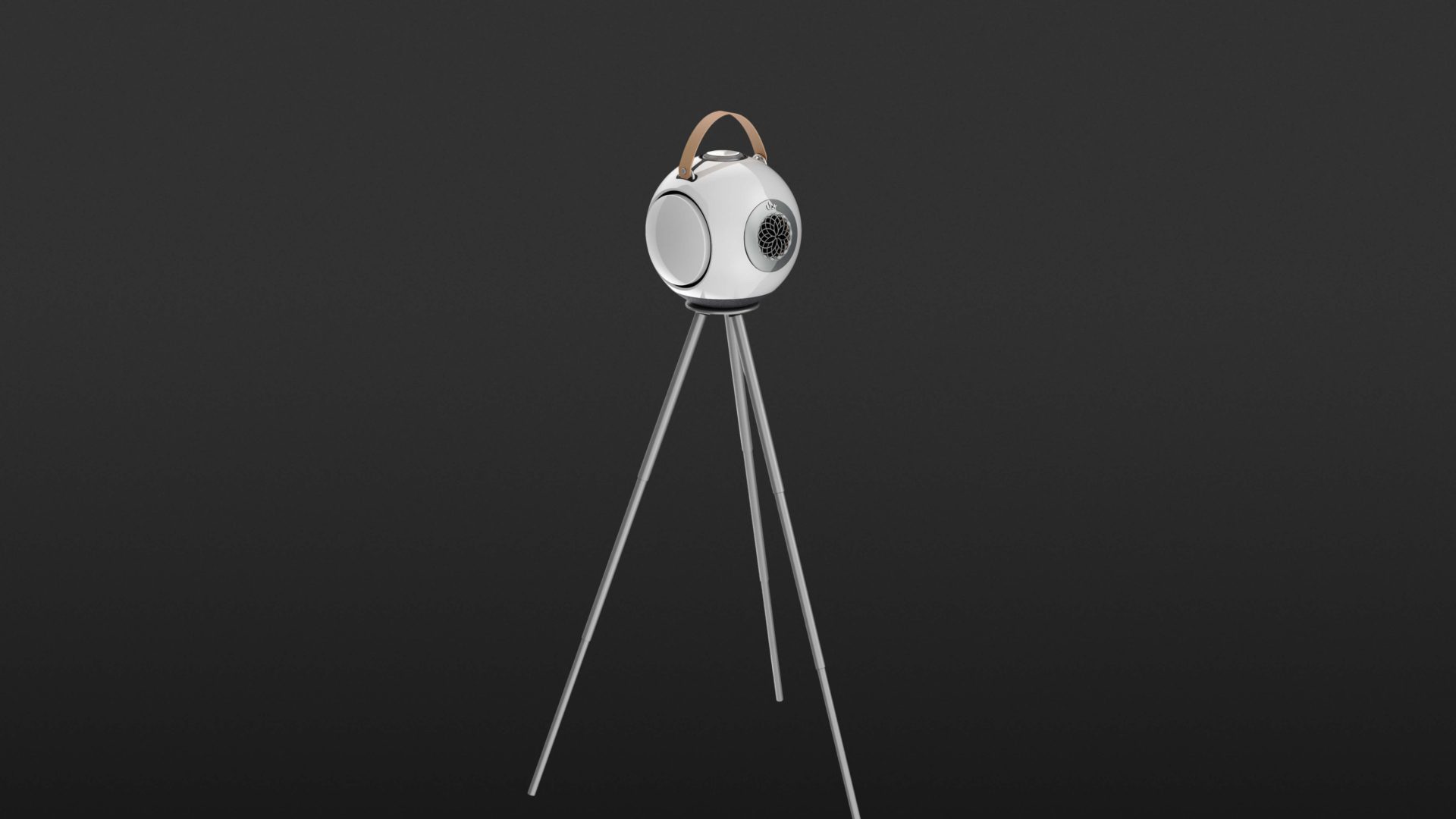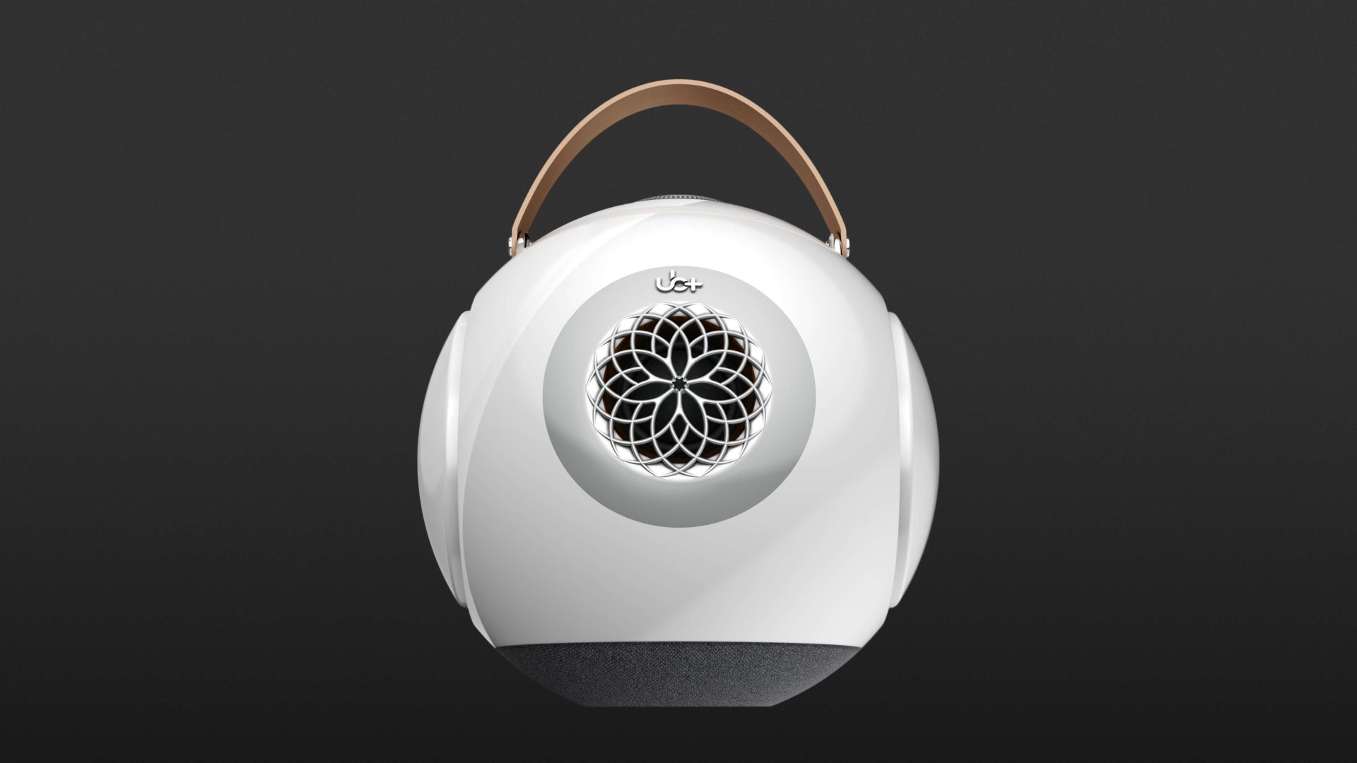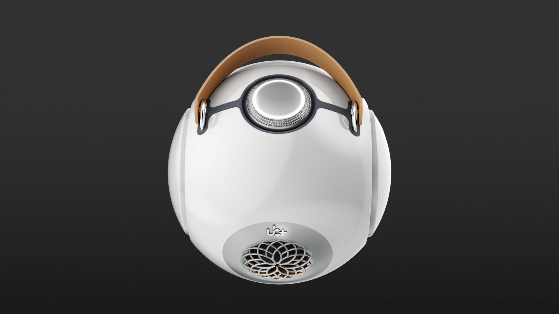 Zusammen mit dem dB1 Doublebass liefert UB+ noch ein USB-C-Kabel, einen Ledertrageriemen und ein kleines, höhenvariables Dreibeinstativ aus Metall, auf dem, dank eines starken Magneten, der dB1 sicher und fest abgestellt werden kann. Die kugelige Box ist aus sehr stabilen Polycarbonat gefertigt und gefällt durch ihre hochglänzende, glatte Oberfläche. Deren Front wird durch die Öffnung des 1,5 Zoll Hochtöners festgelegt, der hinter einer floral anmutenden Gitterstruktur geschützt 20 Watt Leistung bereitstellt.