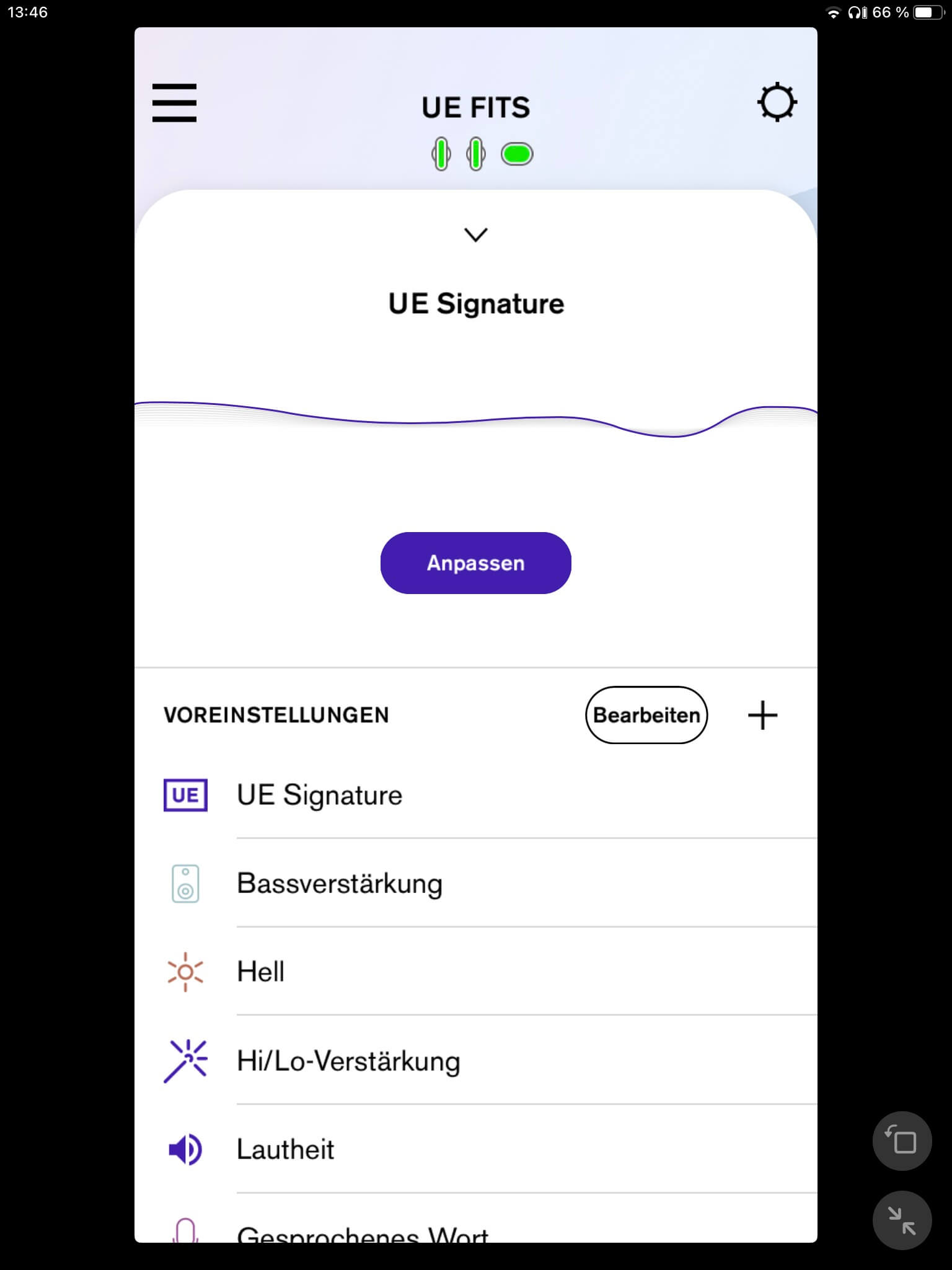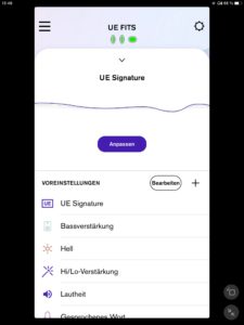 Ergänzend zur Remote-Konfiguration und der Anpassung der Gelaufsätze stellt die UE FITS App (Android und iOS) einen Passform-Test mit Support-Anbindung zur Verfügung, um Probleme gegebenenfalls zu beheben. Zur Klangregelung stehen darüber hinaus sechs vorkonfigurierte Presets wie „Bassverstärkung“, „Hell“, „Lautheit“ oder „Gesprochenes Wort“ und ein 5-Band-EQ für eigene Einstellungen zur Auswahl, die gespeichert werden können. Zu den weiteren Funktionen zählen eine separate Akkustandsanzeige für Hörer und Case, Firmware-Aktualisierungen und eine Bedienungsanleitung. Wer möchte, kann über die App zudem ein Selfie aufnehmen.