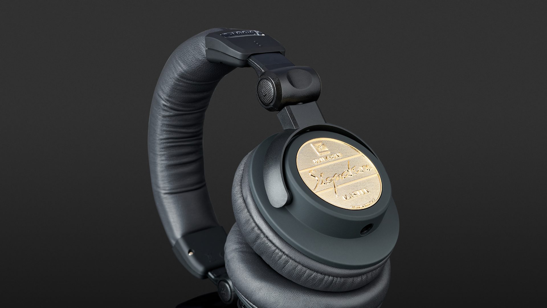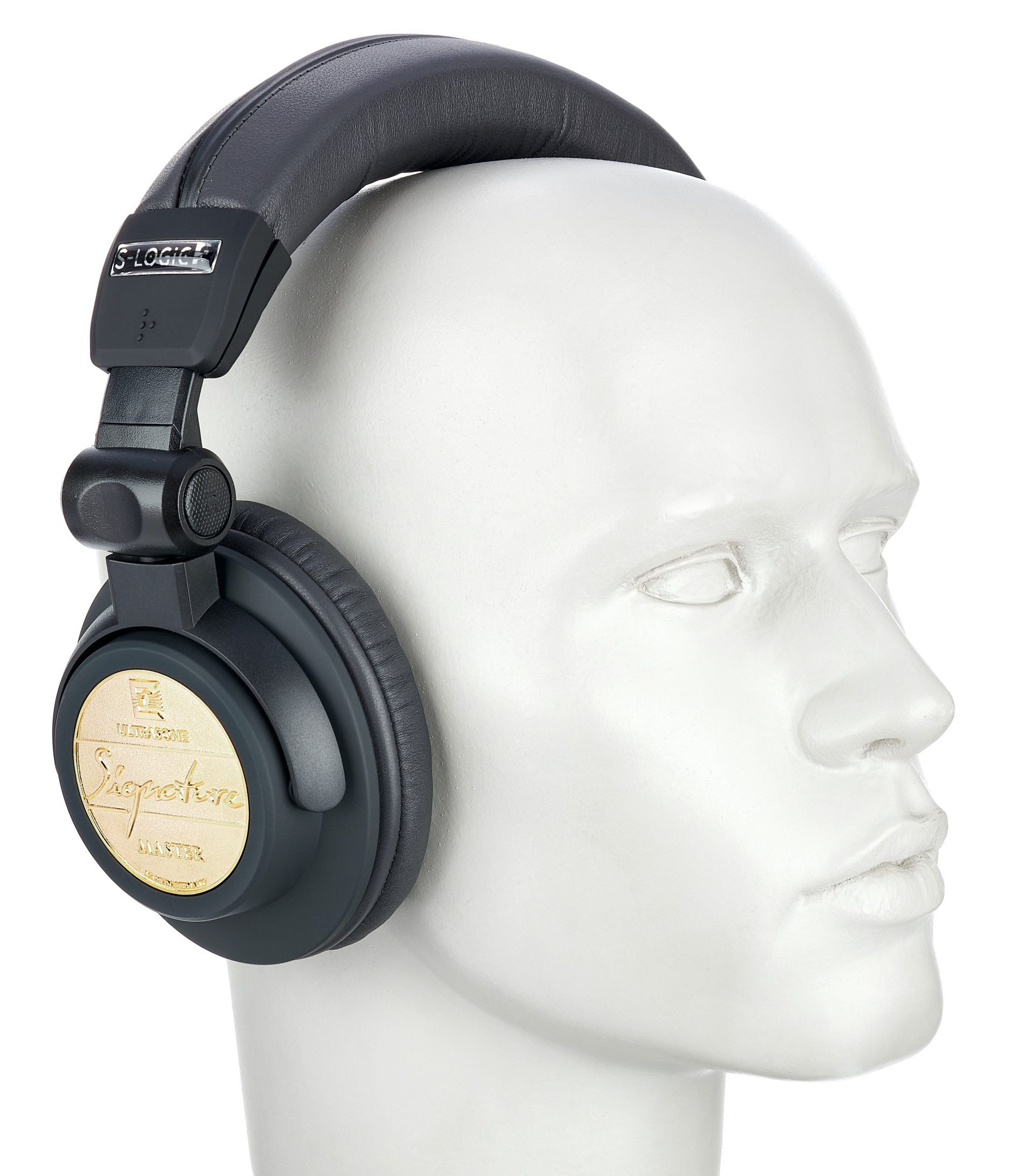 Die Optik der Signature-Serie ist deutlich robuster gewählt als die der Pro-Serie, und die gesamte Gestaltung macht deutlich, dass es sich hier um ein Arbeitsgerät handelt. Der nahezu komplett in Schwarz gehaltene Kopfhörer macht nämlich einen soliden Eindruck. Besonders auffällig sind seine echt vergoldeten Plaketten auf den Rückseiten der Hörschalen. Die Idee dahinter ist, dass der Kopfhörer besonders wertig aussehen soll. Eventuell ist der Hersteller hier einen Schritt zu weit gegangen? Für mich zumindest ist der Anblick der beiden großflächigen goldenen „Taler“ gewöhnungsbedürftig, aber das ist ja schließlich Geschmackssache. Zudem fällt auf, dass die mattschwarzen Teile an den Schalen sowie des Kopfbügels empfindlicher gegenüber Schweiß und Fettrückstände durch Berührung sind. Das bedeutet, dass der Kopfhörer bei häufiger Nutzung Pflege bedarf, wenn er nicht schnell abgerockt aussehen soll.