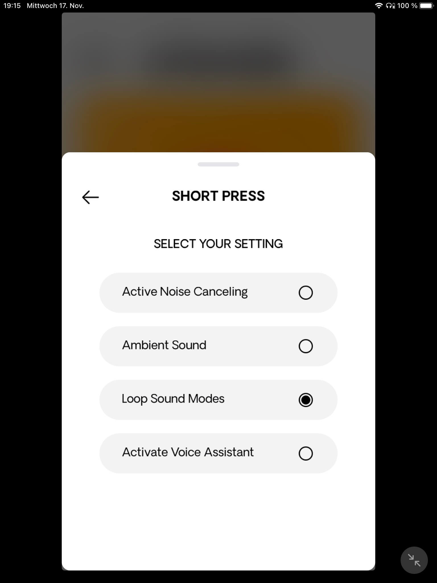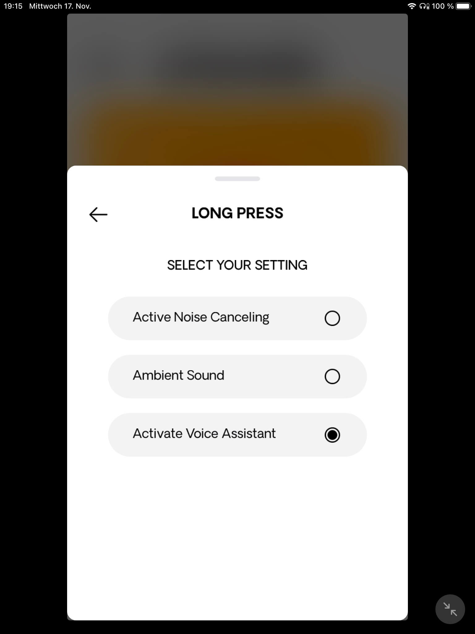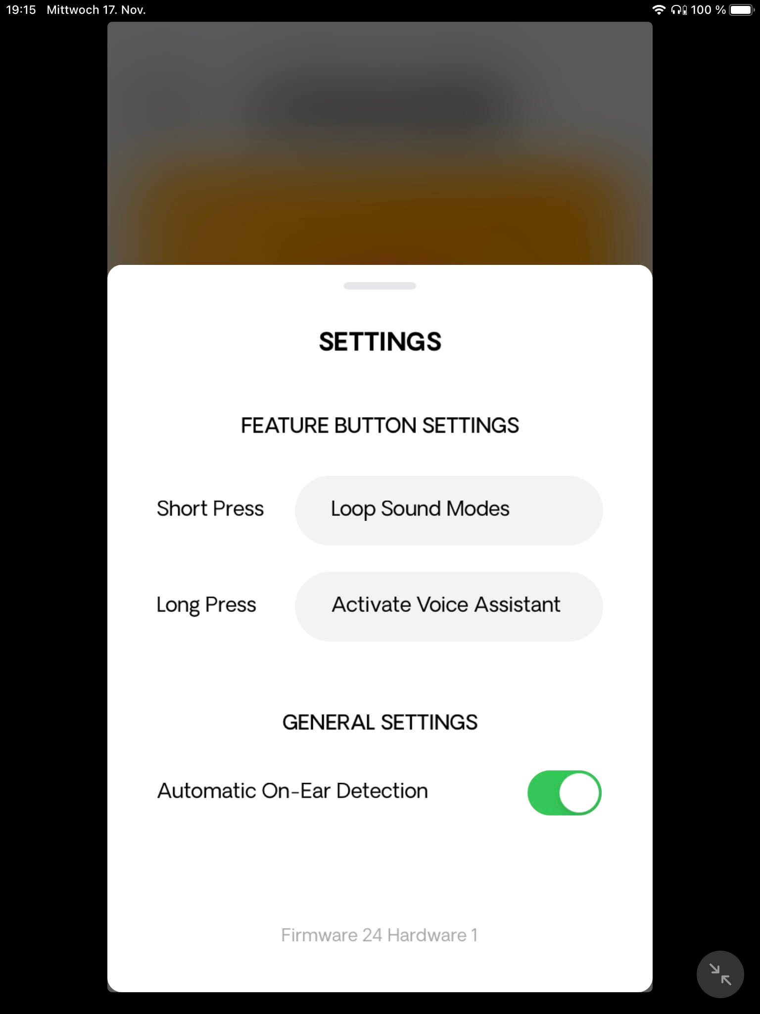 Zum Umschalten zwischen ANC-, Umgebungs- und Grundmodus steht an der linken Hörerseite eine separate Funktionstaste zur Verfügung. Diese kann durch ein kurzes Gedrückthalten darüber hinaus Sprachassistenten aktivieren, was insgesamt einwandfrei funktioniert. Über die App ist auch eine sensorgesteuerte Trageerkennung der Los Angeles (de-)aktivierbar, wodurch die Wiedergabe beim Ablegen automatisch pausiert und mit dem erneuten Aufsetzen fortgeführt wird.