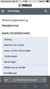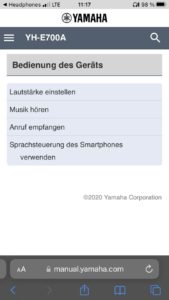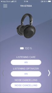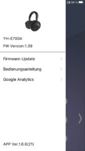 Die zugehörige kostenlose App „Headphones Controller“ für iOS und Android ist eher reduziert. Sie bietet mögliche Firmware-Updates (Stand 1.39), eine regelbare Power-Off-Funktion, die Möglichkeit, zwischen den Noise-Cancelling-Betriebsarten zu wechseln und das Handbuch online aufzurufen. Ein Equalizer oder erweiterte Parameter werden nicht geboten, dafür aber die Option „Listening Care“, die eine zuschaltbare lautstärkeabhängige Korrektur des Frequenzgangs im Sinne einer Loudness-Schaltung ermöglicht. Eine weitere Technik namens „Listening Optimizer“ ist ebenfalls zuschaltbar und nutzt laut Yamaha Messungen über ein internes Mikrofon, um die Klangwiedergabe an das Ohr des Hörers und den Sitz der Kopfhörer anzupassen. Diese Messungen erfolgen alle 20 Sekunden und sollen damit Veränderungen der Trageposition kompensieren.